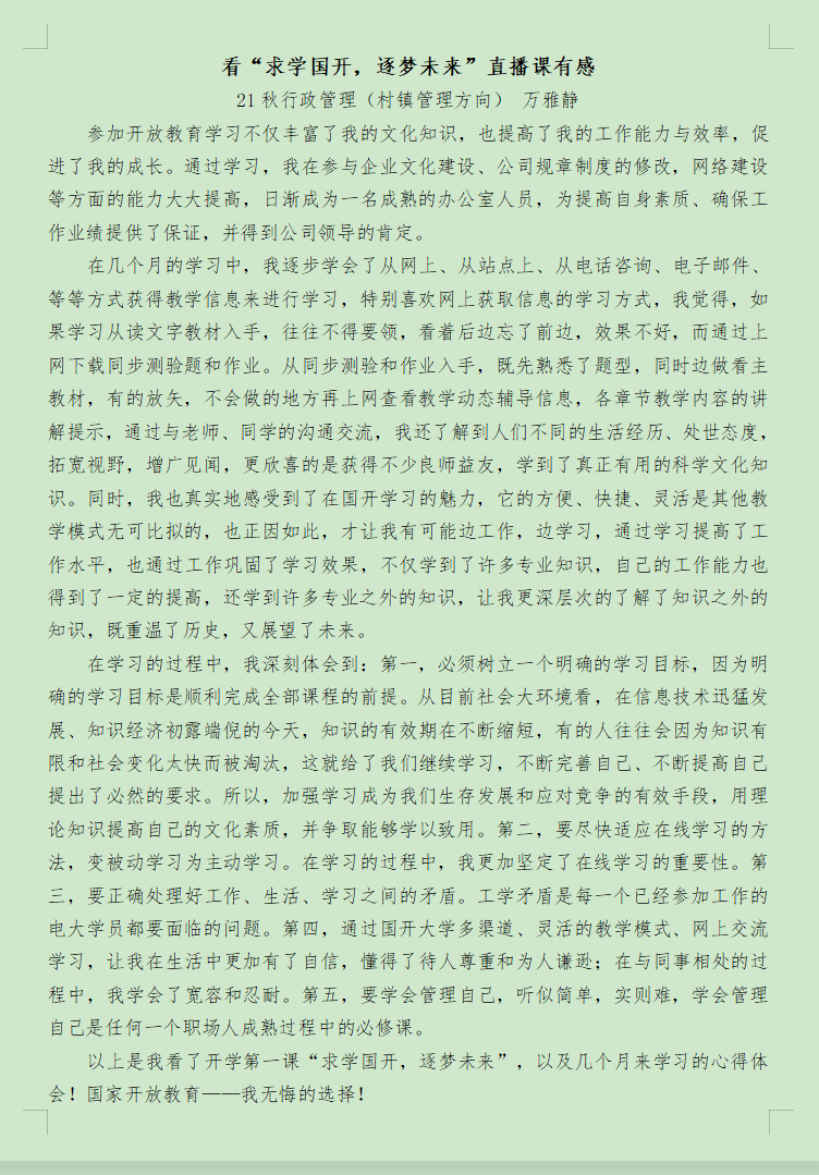 国家开放大学党委委员、副校长李松以视频直播方式给我们分享了主题“求学国开,逐梦未来”开学第一课。他首先介绍了国家开放大学的概况和办学成就,从国家开放大学优秀校友的视角呈现了国学开放大学办学理念、办学宗旨、办学形式、办学成就,让我们对开放大学有一个系统的了解认知。接着从学员的视角娓娓道来学员在求学期间怎么学、学什么。李松副校长用勤学、自律、悟道几个关键词激励学员有效利用时间,处理好工学矛盾,不断激发内在动力,学习技能,点亮心灵的灯塔,在国开成就最好的自己。最后他从全球视角勉励学员适应时代发展需要,改变自己,设定目标,同国开与时俱进,逐梦未来。